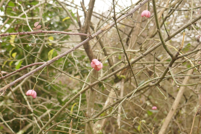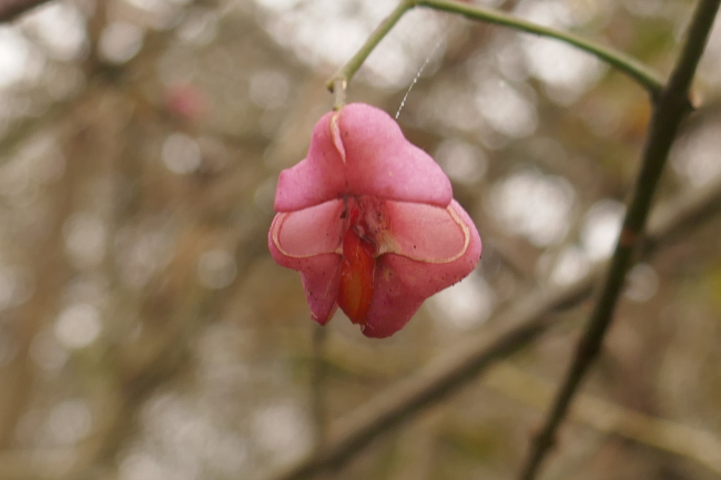 Quelle métamorphose entre la délicate fleur d’églantier, rose tendre, fine et délicate et ce réceptacle rouge vif. Le second était pourtant le support de la première. Ce n’est pas sans une certaine nostalgie pour la douceur du printemps que je me remémore cette fleur. Une autre époque au même endroit. Une époque où les fleurs comptaient sur les insectes pollinisateurs pour transporter leur pollen. Dans les frimas de l’hiver notre églantier ne peut plus compter sur les insectes, engourdis par le froid. Mais les oiseaux sont là pour disperser ses graines. Les cynorrhodons constituent pour eux une source d’énergie bien venue.