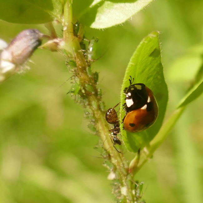 En se penchant pour regarder de près une fleur on ne voit pas que des symbioses entre les insectes et les plantes. Il y a aussi du parasitisme comme en témoignent les feuilles à moitié dévorées. Même les piquantes feuilles d’ortie ne sont pas épargnées. Ces insectes mangeurs de feuilles sont souvent camouflés, prenant la couleur verte des feuilles qu’ils dévorent. Les pucerons se laissent plus facilement repérer. Ils sont petits mais nombreux, affairés à sucer la sève de la plante sur laquelle ils sont posés. Pas loin des pucerons, une coccinelle attend en embuscade, prête à en dévorer quelques uns. Si elle n’est pas elle même chassée par des fourmis qui protègent les pucerons … dont elles « traient » le miellat.